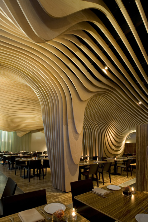 By way of sharp contrast the Banq restaurant is a space that has completely disguised the straight edges of its dimensions by embracing more fluid, organic shapes. The large proportions of this room have been blended into a much more intimate and dramatic space; with heavy use of wood throughout helping to bring a sense of warmth and a very inviting atmospheric quality.