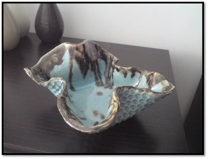 The pictured bowl is handmade and takes pride of place in my bedroom. It picks out the accent colour of powder blue used elsewhere in the space and adds visual stimulation because of its use of form and texture. AND its unique!!