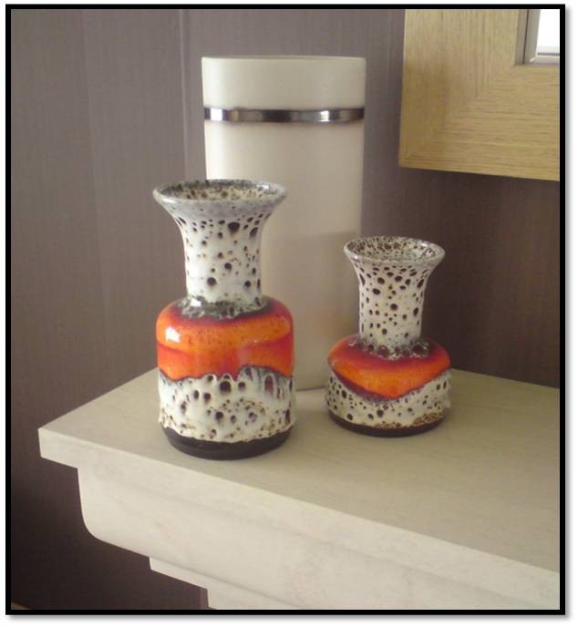 Can you believe that the above Jasba vases were hiding in a cupboard at my mum’s house before I rescued them? They are vintage; original and completely unique (never mind collectable!!) and should be allowed to shine. The accent colour in the above space was orange and these little vintage gems complimented the colour scheme to perfection. To add a little height and provide contrast I positioned a contemporary Jasper Conran vase behind them – its minimal aesthetic with metallic detailing adds to the overall visual display.