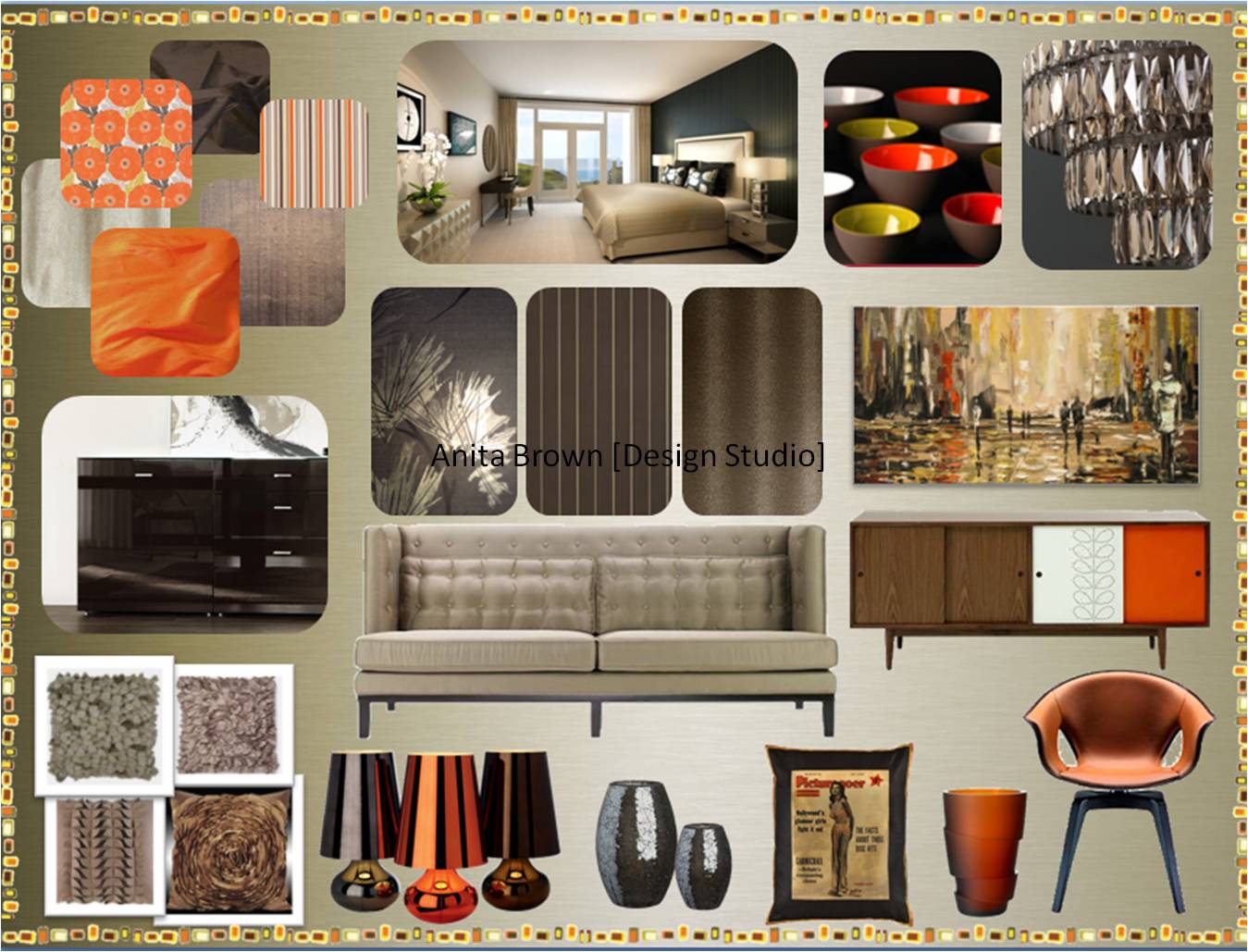 This style of interior design is sleek, polished and showcases glamour, luxury and contemporary design to great effect. But why should it be restricted to Boutique Hotels?! Heck, we all deserve a little luxury! I have provided my take on this style but with a quirky twist: RETRO baby!! The inclusion of quirky/retro pieces is made all the more possible because of the great contrast they provide to the more streamlined, modern look (as long as the contemporary and quirky are of high quality within their own right). So, not only have I included retro-inspired items, but I have also introduced the colour orange to help break up the earthy tones and further underpin the retro vibe (the colour orange has strong retro connotations). This colour palette is about sleek and soothing minks, rich chocolates, and a refreshing splash of orange for an individual and quirky look.