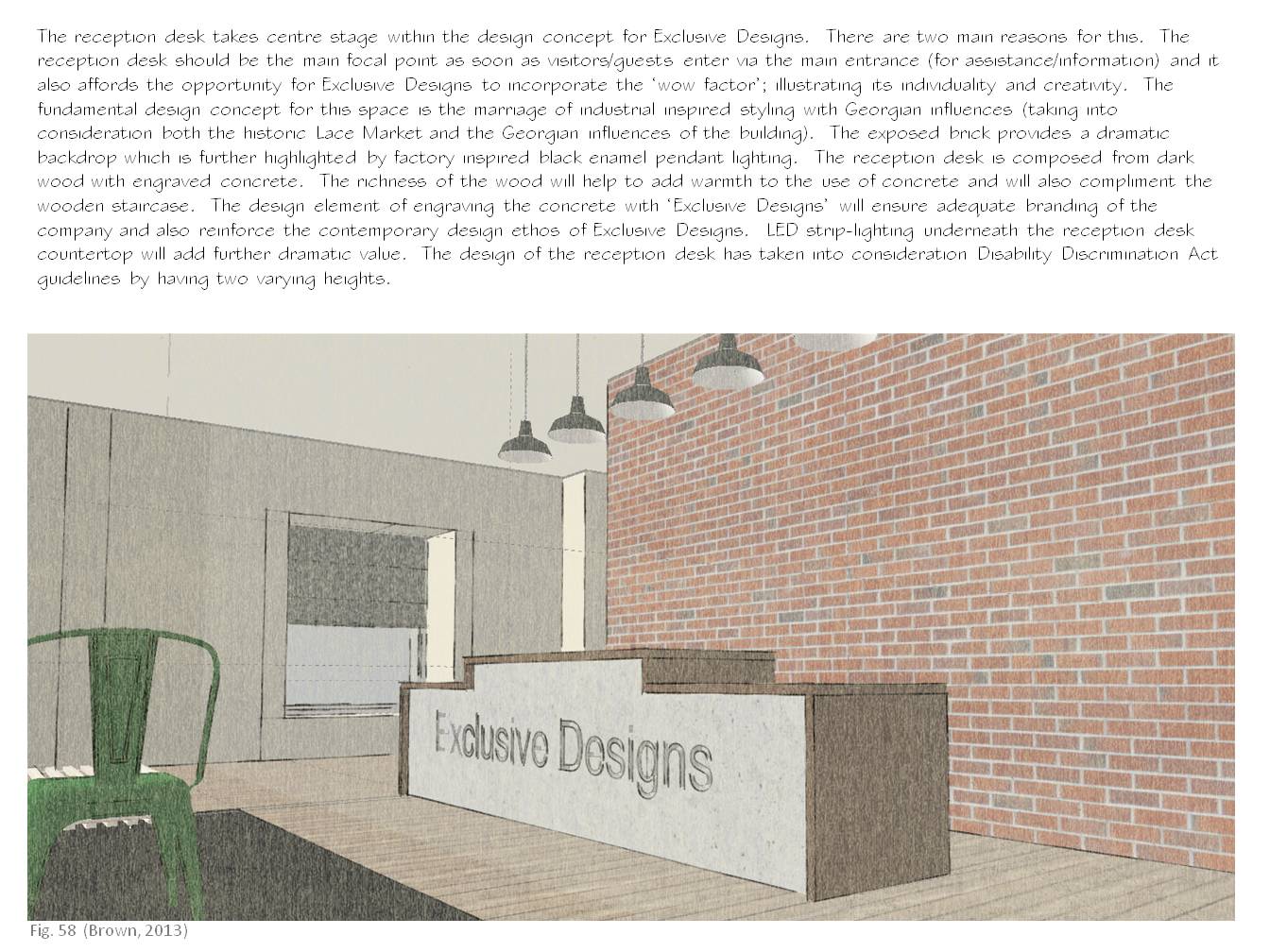 Another illustration of the reception area and in particular the design of the reception desk with factory inspired pendant lighting (and exposed brick).