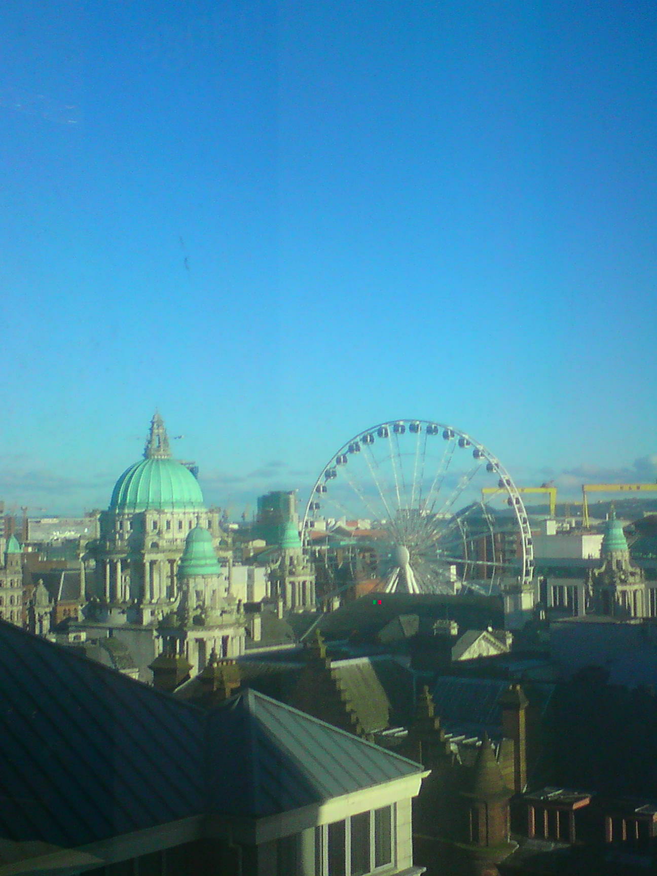 This isn’t an overally crisp photograph but I was in the office one sunny day and couldn’t resist taking this snap of the city especially with the iconic and historic Harland & Wolff cranes in the background (I want to start talking about Titanic but I don’t want this to turn into a history lesson. Moving on). Notice the equally impressive domed architectural features of Belfast City Hall (they were originally copper but due to oxidation are now green. Jeepers, now this sounds like a science lesson. Moving swiftly on).