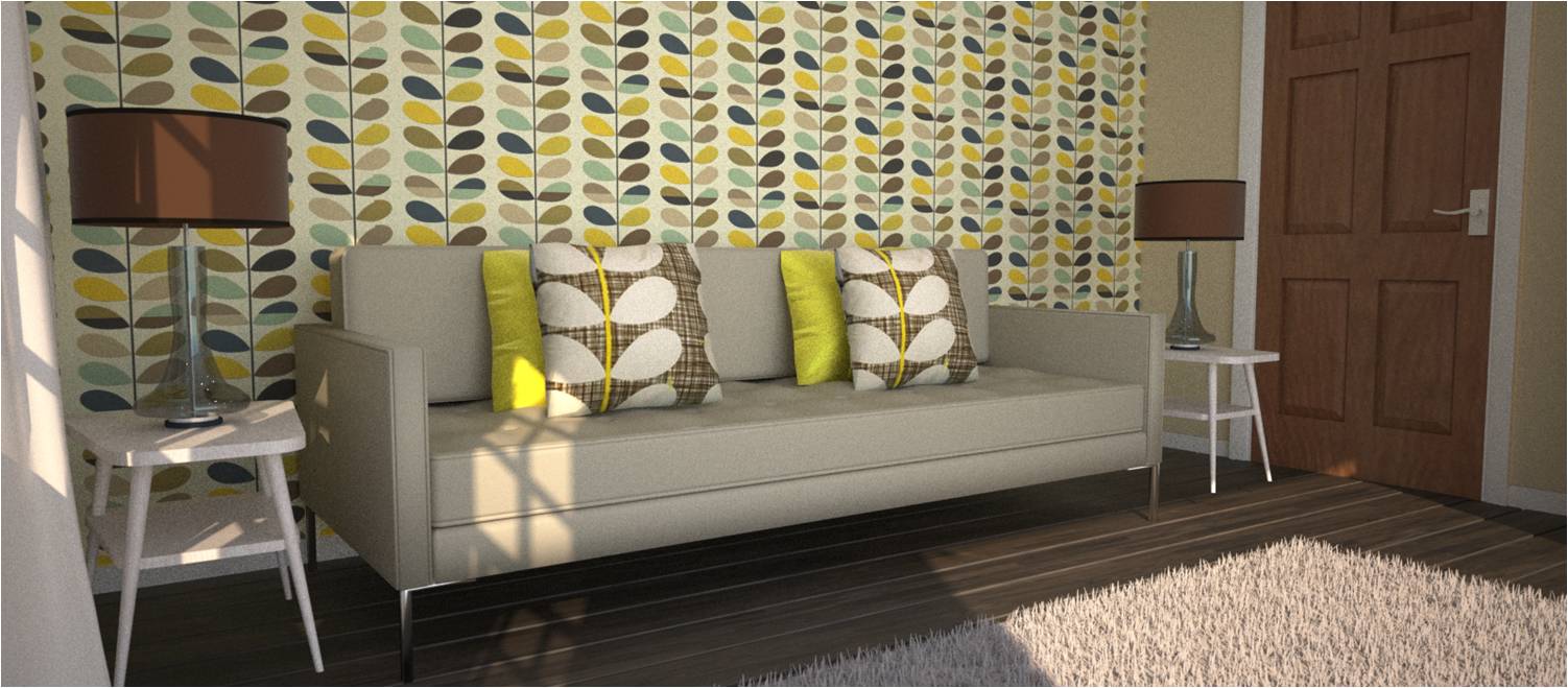 And just because colours, textures and design schemes can look very different depending on the environment lighting, I’ve included a daytime shot. I also wanted to show off my progress in rendering now that I’ve learned how to create a heavily textured rug (yes, I’m showing off but it only took countless gut-wrenching hours to work out how to do it; cut me some slack!).