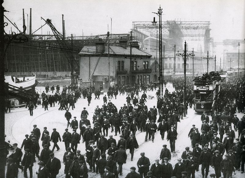 This is an iconic image of Harland & Wolff (at clocking out time) – it illustrates the booming shipbuilding industry in Belfast in the early 1900s and the important role that Harland & Wolff played regarding employment and commerce. The ship being built in the background is the one and only Titanic.