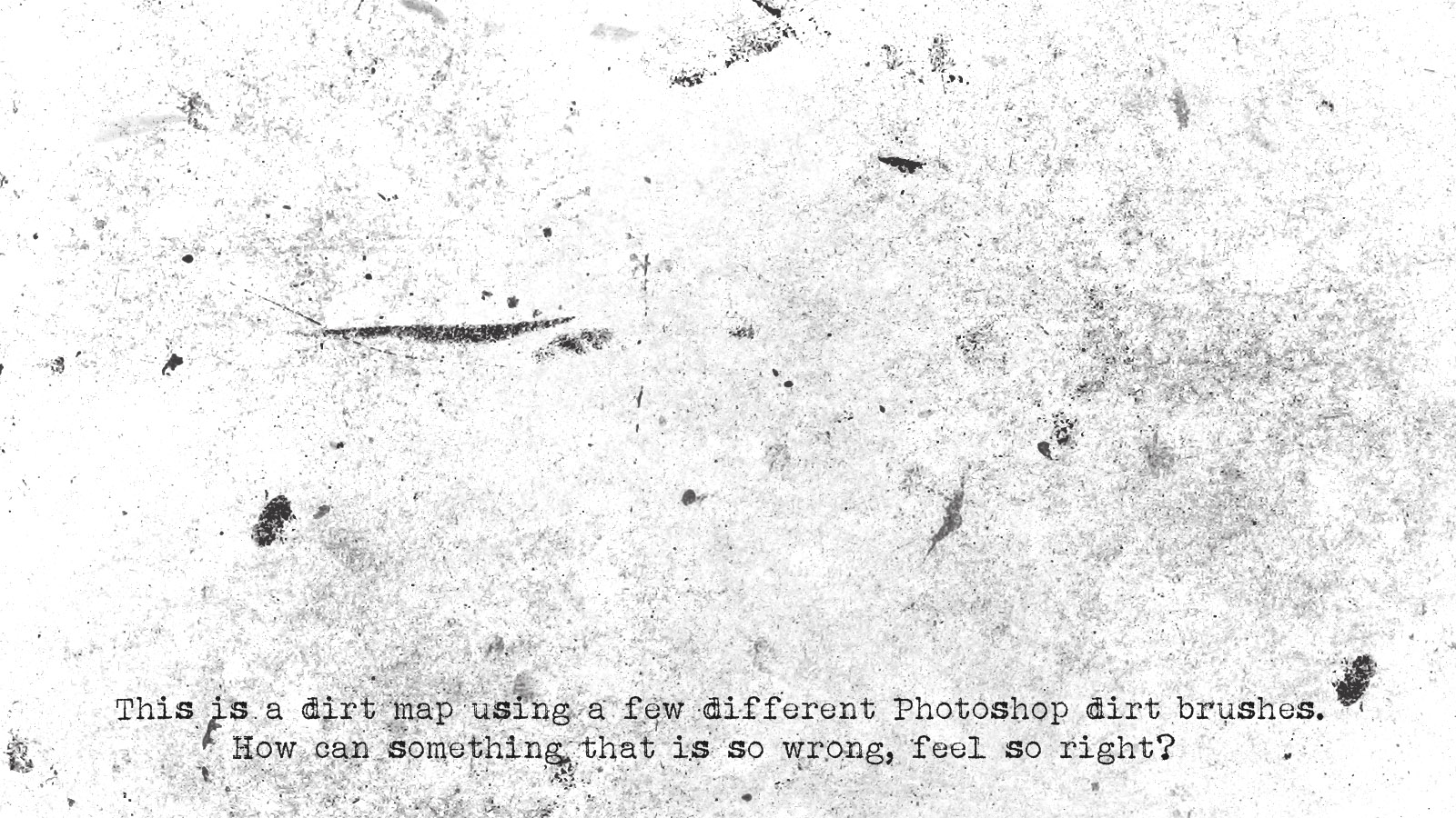 Then you download a few lurid ‘dirt’ or ‘grunge’ Photoshop brushes (yes, they are actually referred to as ‘dirt’) and then set about creating your dirt map.