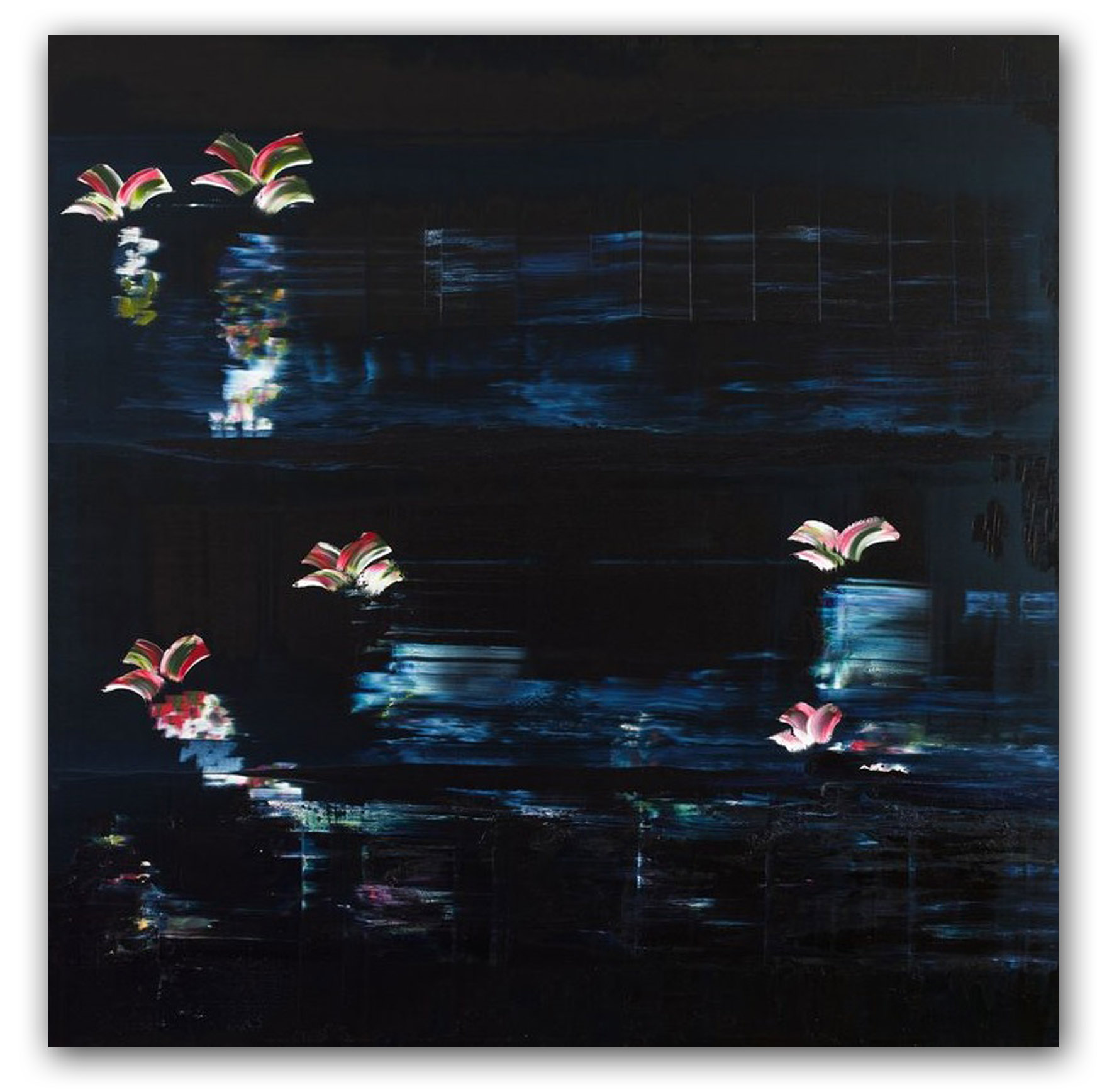 Ok, I lied. I do have a (new) favourite and it’s this one. The depth of colour is amazing and its stark contrast to the vivid and bright colouring of the flowers (lilies?) visually lifts the entire piece. I love it. A lot! Dark, inky hues are seriously on trend at the minute in the interior design field and incorporating a piece of art like this would certainly reinforce a contemporary, edgy and dramatic twist to any interior.