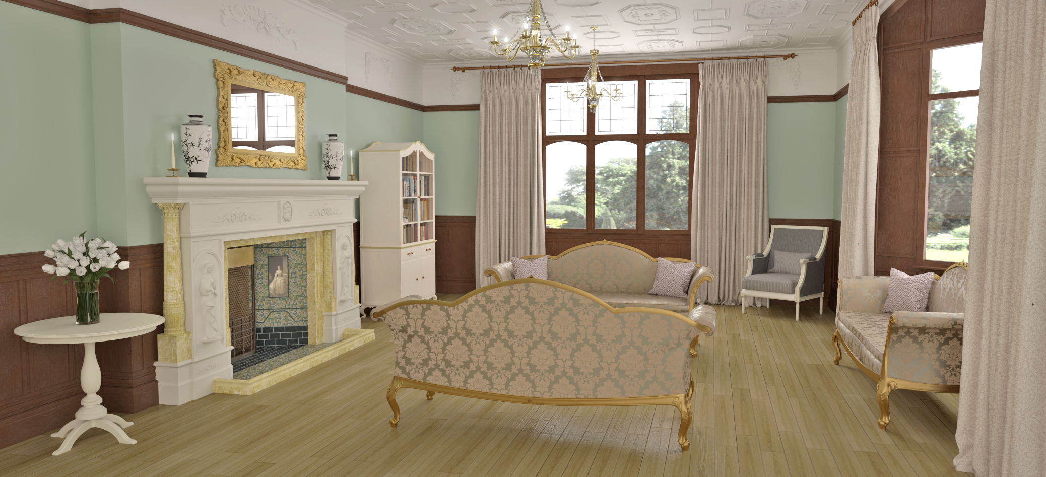 Whilst the exterior looked absolutely picture-perfect, the interior needed a little TLC, so major refurbishment was required.  My role was to create photo-real images of a number of the interiors, for use in the marketing of the property as a new Wedding venue.  I was required to liaise with both the owner and the appointed Interior Designer, to ensure that the vision for each space was accurately depicted.